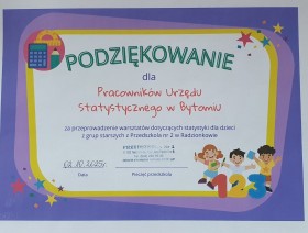 Na zakończenie spotkania przedszkolaki poznały bajkę o „Dzielnym Gustku w krainie liczb”. Każdy uczestnik spotkania otrzymał dyplom „Małego Statystyka” oraz upominki promocyjne.