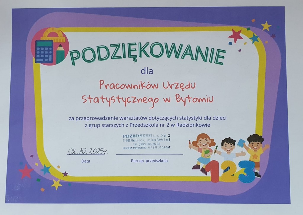 2.10.2025 r. pracownicy Urzędu Statystycznego w Katowicach Oddziału w Bytomiu p. Anna Bartosik oraz p. Beata Rogóż przeprowadziły zajęcia edukacyjne w Przedszkolu nr 2 w Radzionkowie.